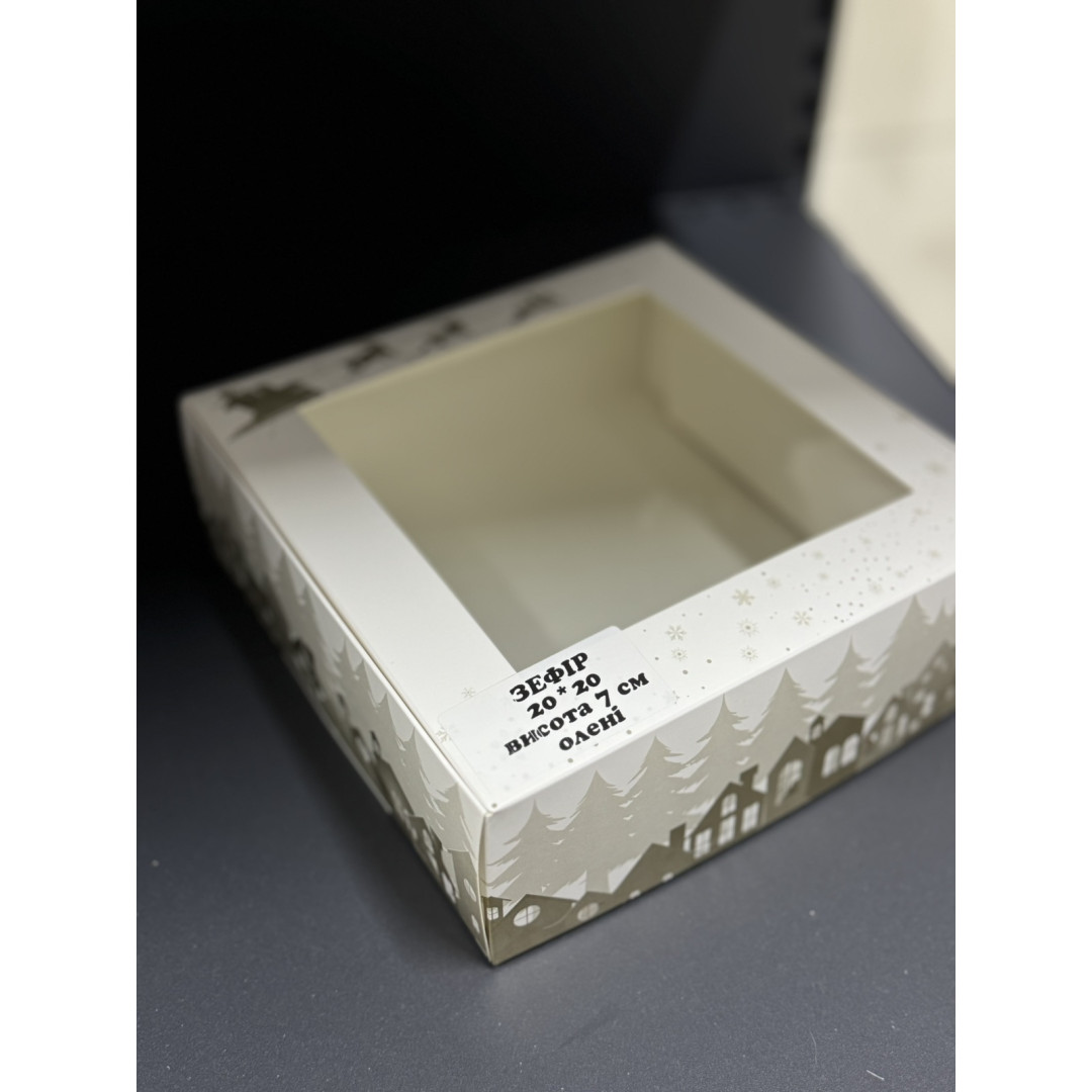 Коробка для зефіру 20*20*7 см з вікном Олені золот. хатинки синя