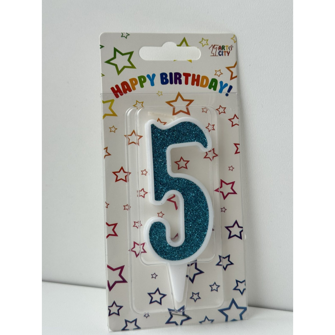 Свічка цифра біла бірюзовий глітер 5