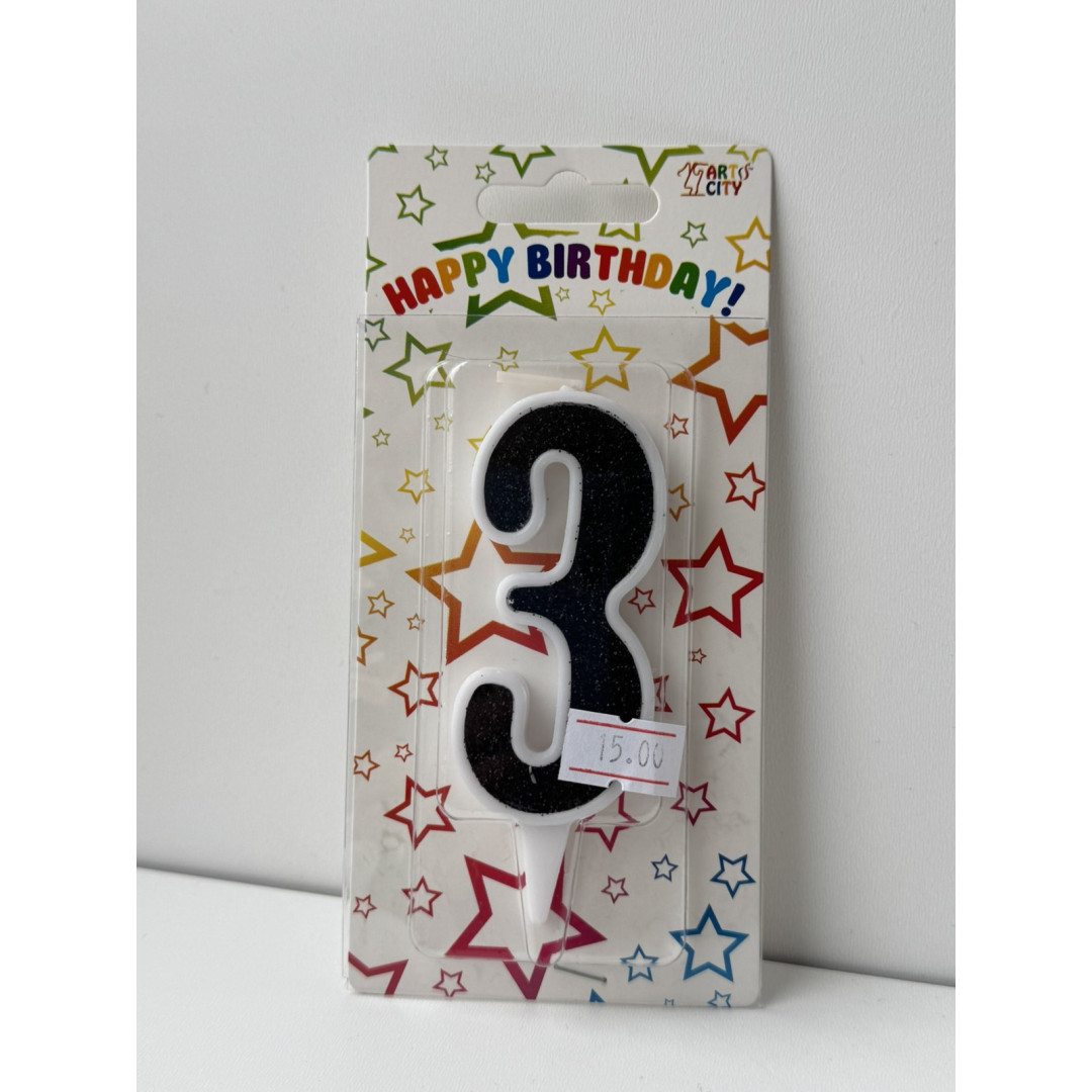 Свічка цифра біла чорний глітер 3