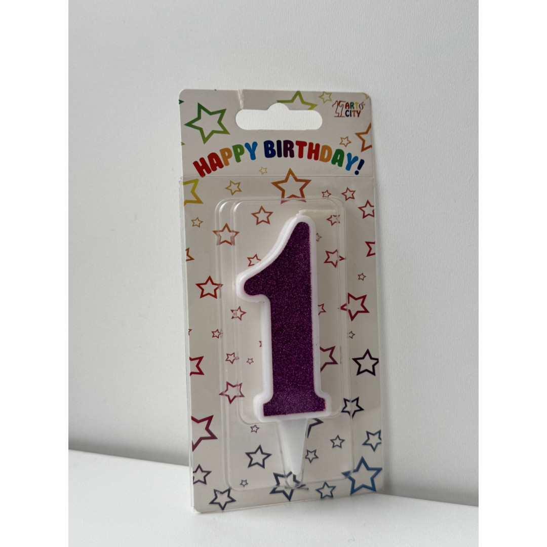 Свічка цифра біла фіолетовий глітер 1