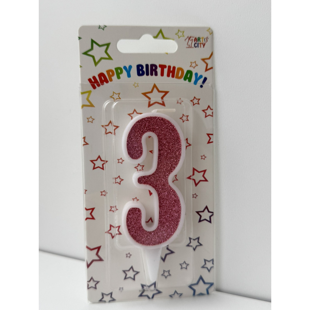 Свічка цифра біла рожевий глітер 3