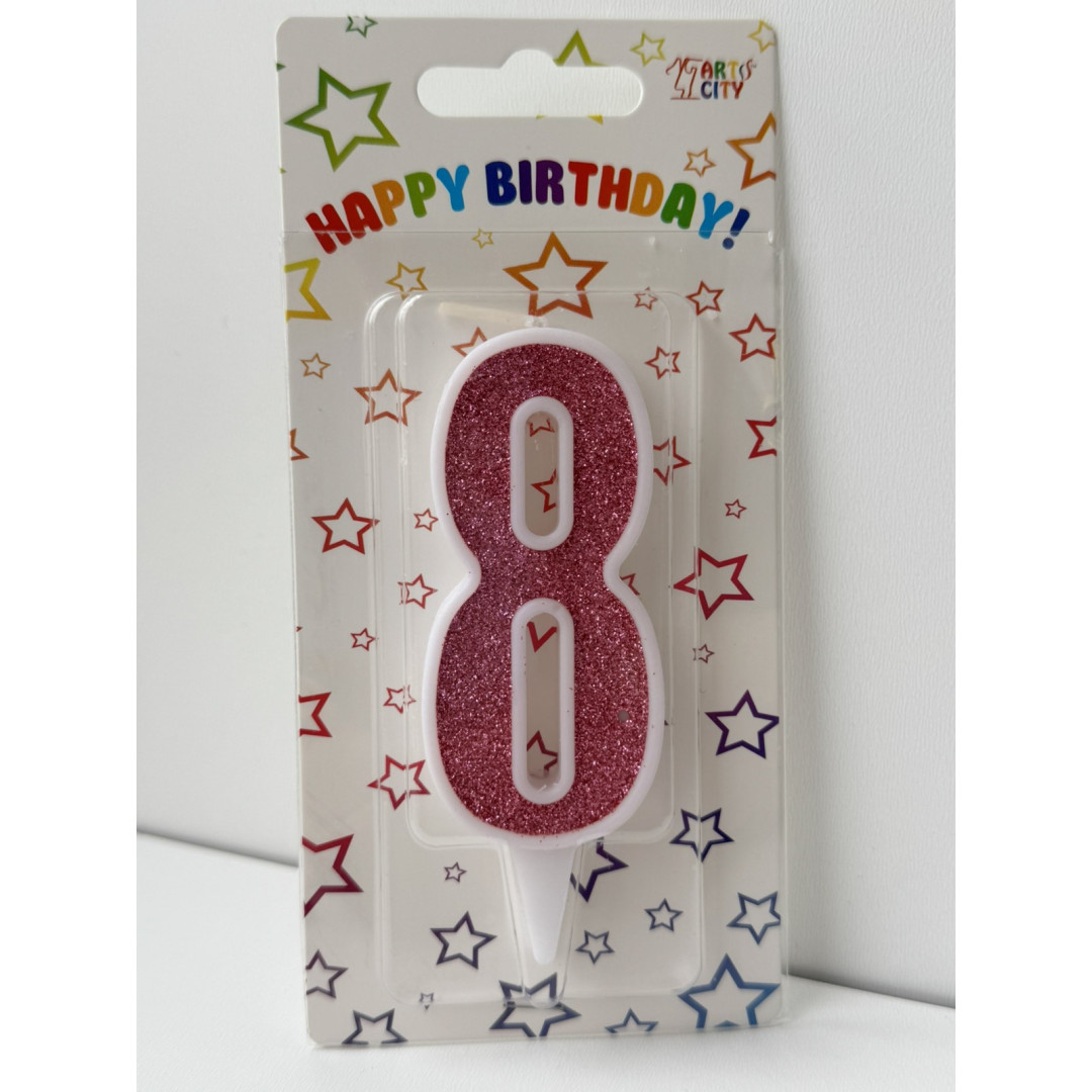 Свічка цифра біла рожевий глітер 8
