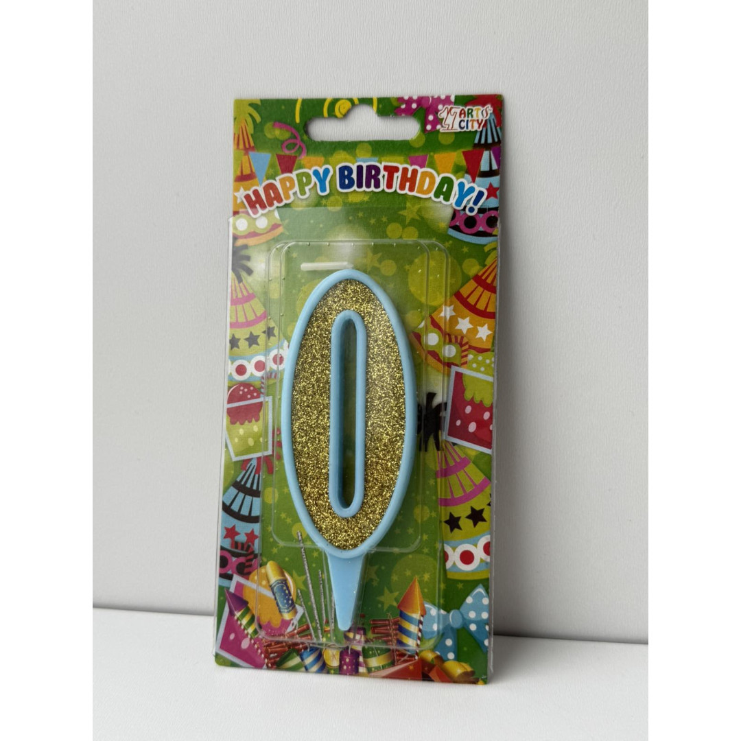 Свічка цифра блакитна золотий глітер 0